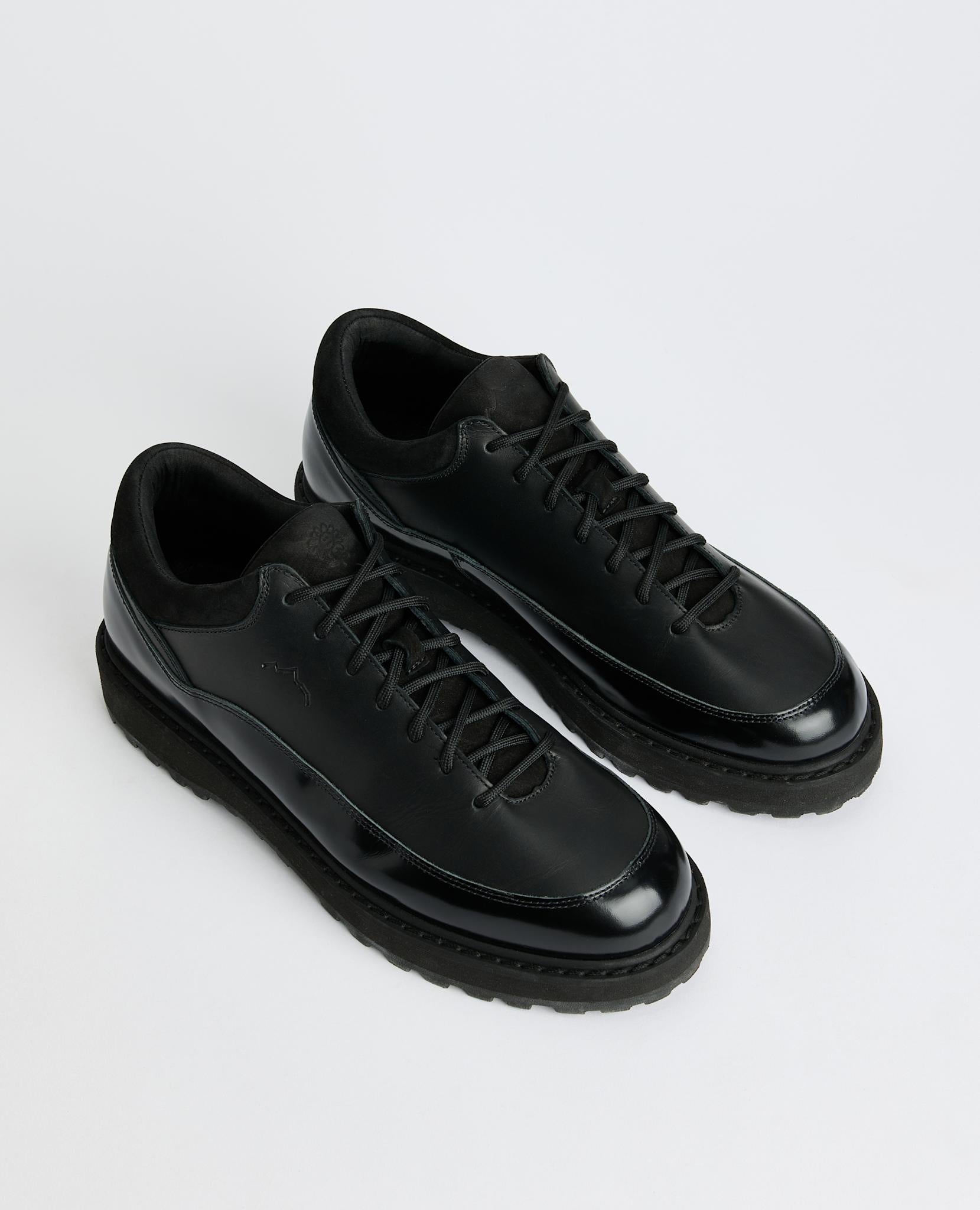 Based on the Cornaro Gomma, a low cut hiking shoe with mountaineering origins, the Cornaro Gala removes traditional alpine hardware in favor of classic punched eyelets. The technical rubber rand is reworked through nappa and patent leathers, introducing a shift in texture and finish that elevates the silhouette without altering its core structure. These choices allow the shoe to move away from pure outdoor reference points, opening space for a quieter and more versatile expression.