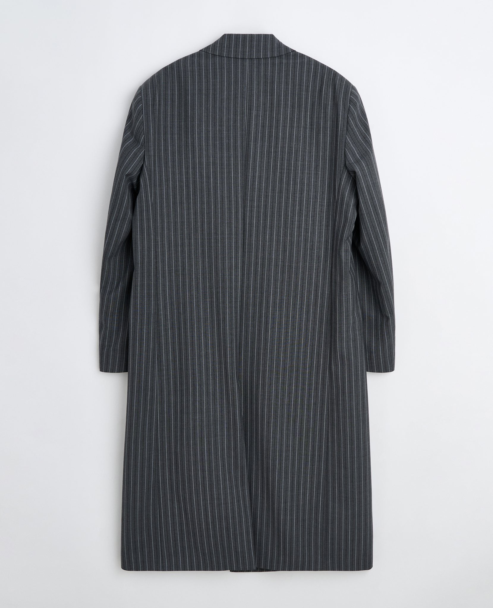 Double breasted wool coat in a refined wool stripe. Sleek fitted and under the knee length.