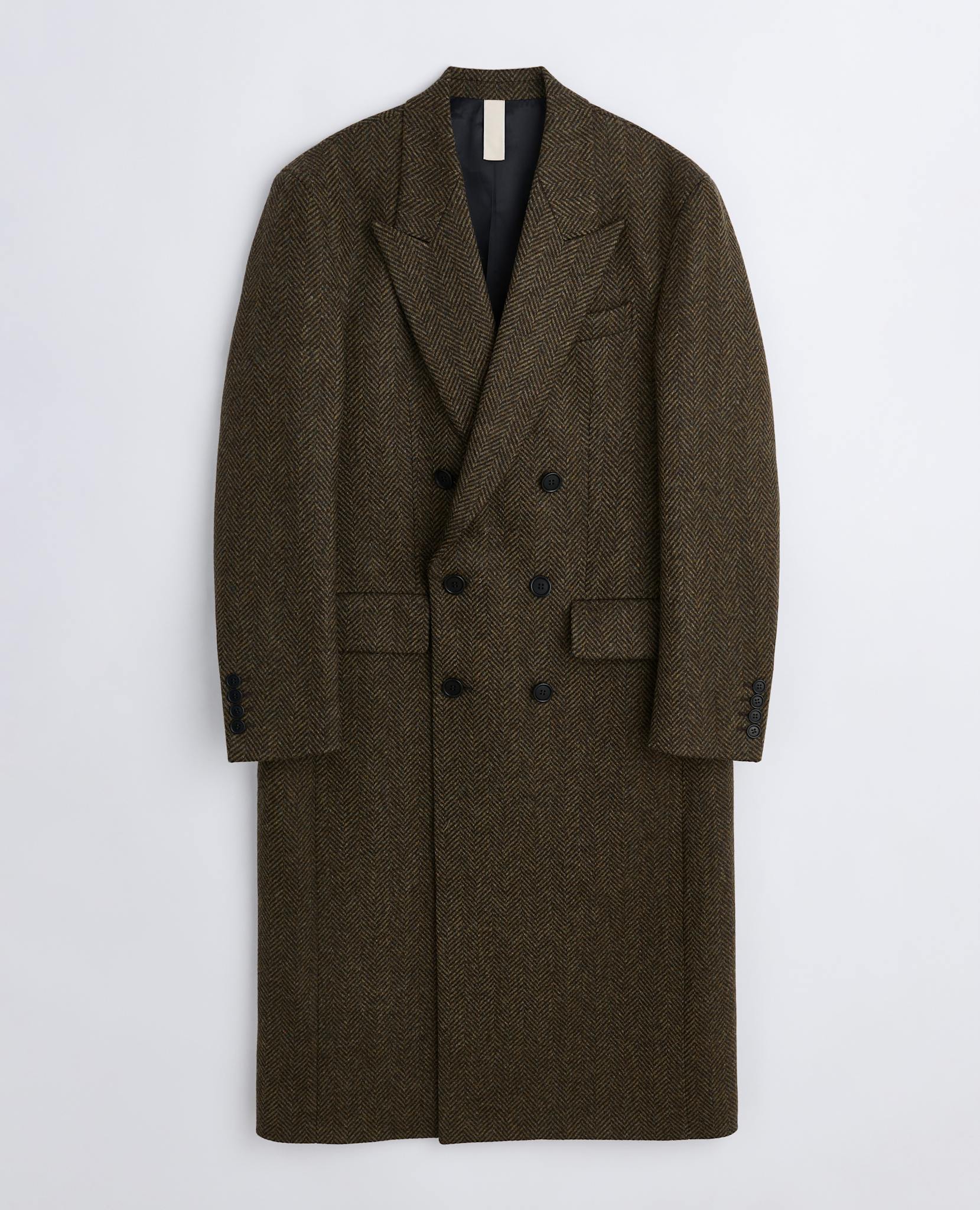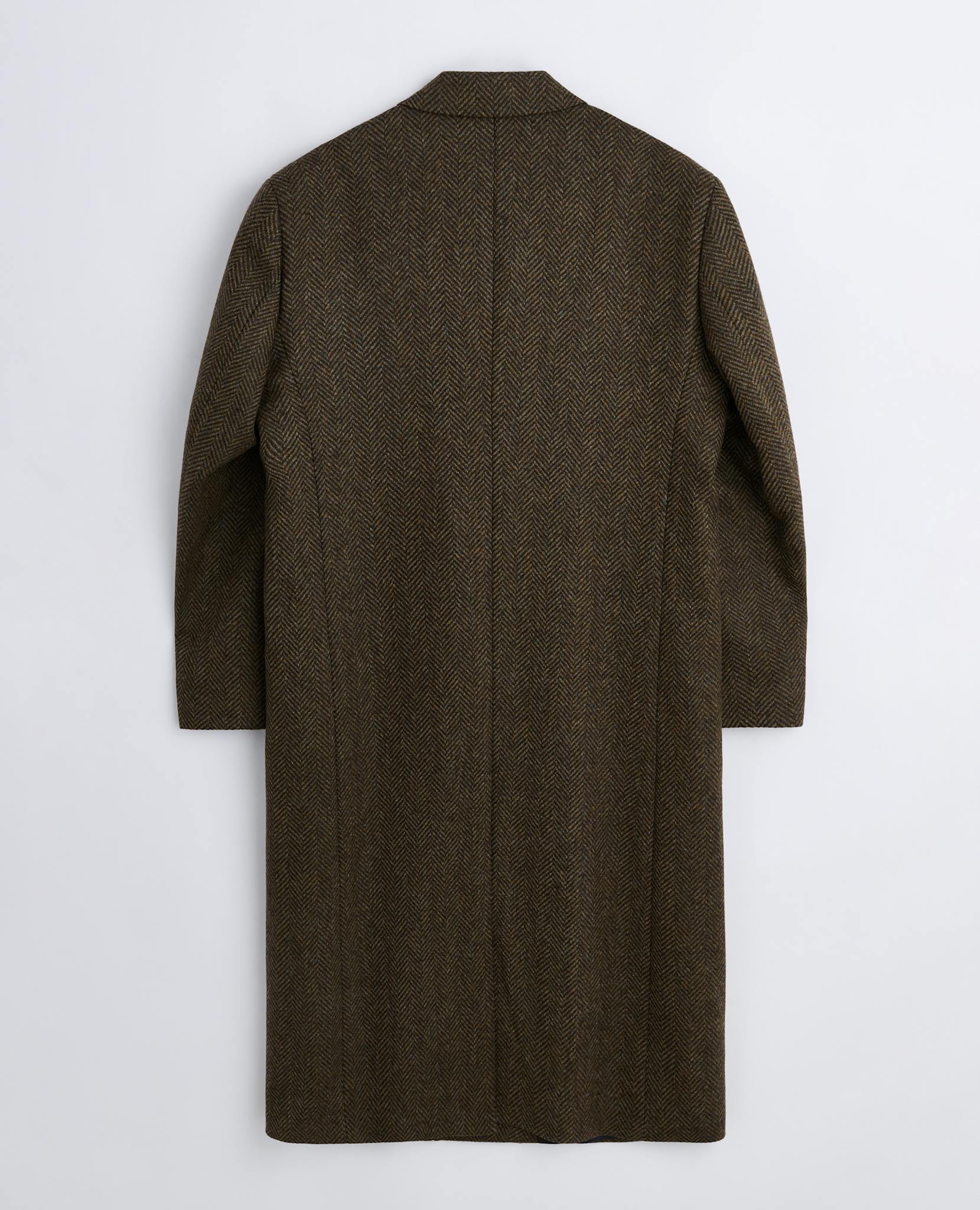 A classic long double-breasted coat with viscose lining. Features peak lapels and closes with two rows of horn buttons. Made in a British herringbone shetland wool.