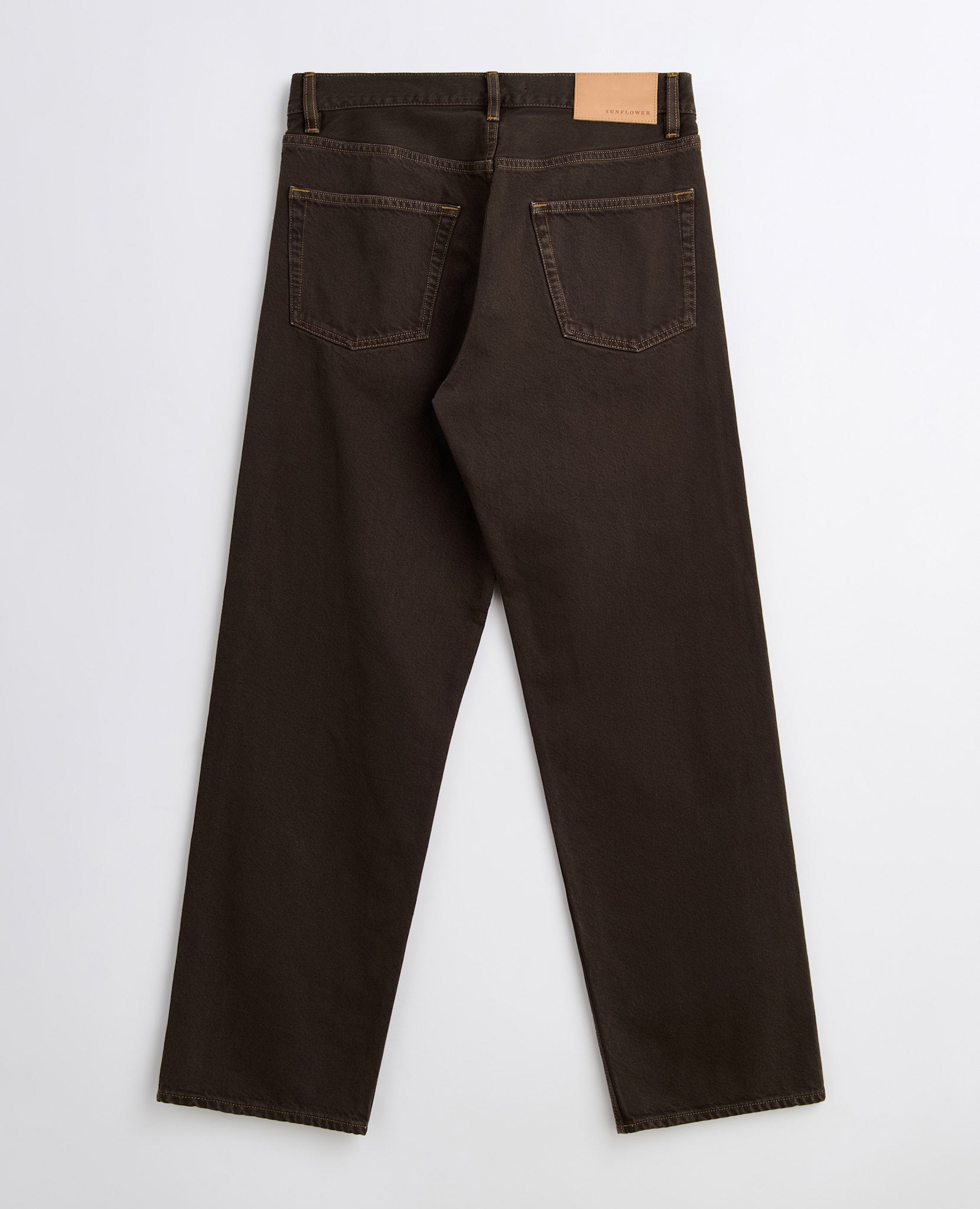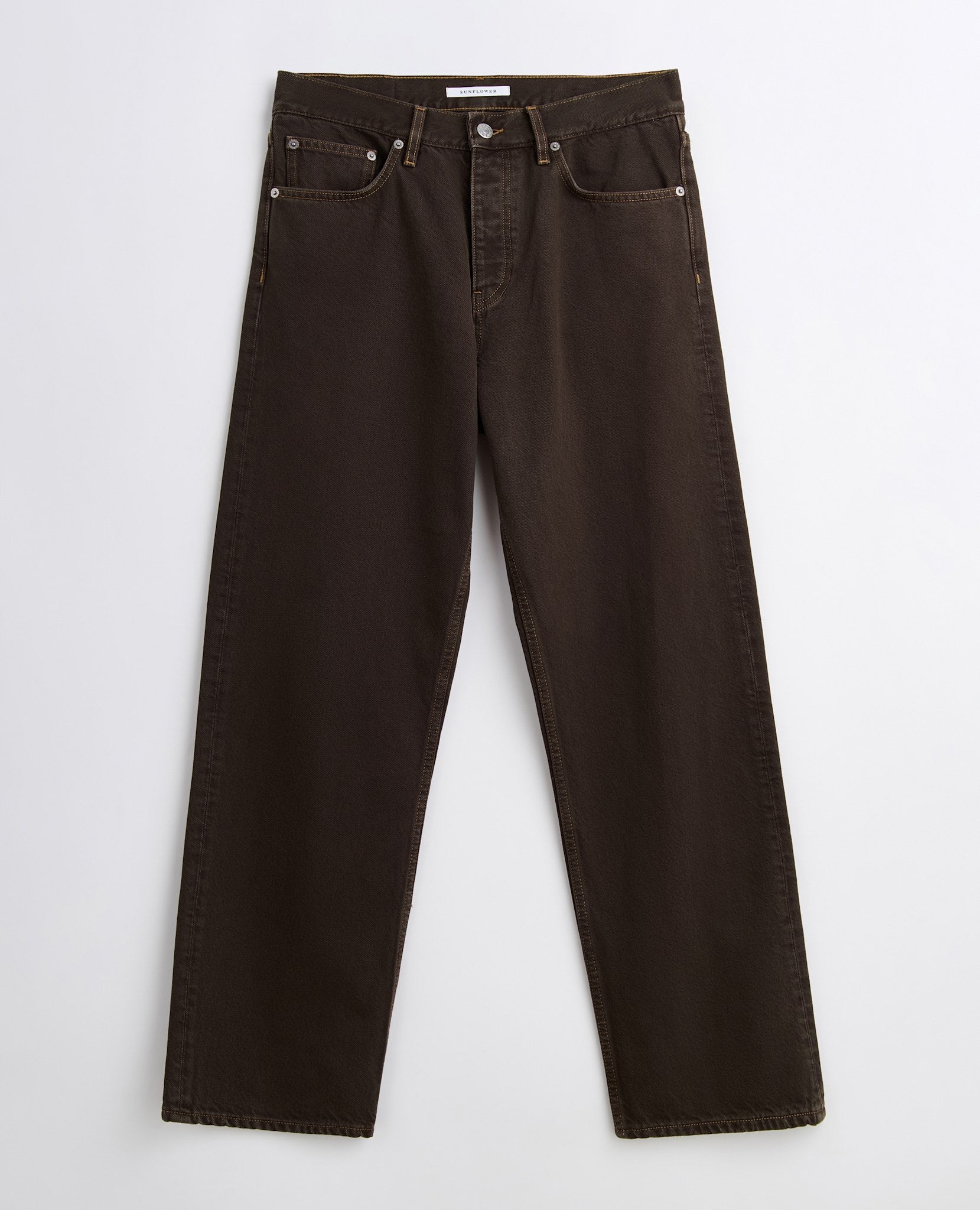Loose fit jeans, garment is dyed to dark brown and then heavily washed for the worn-in feel.