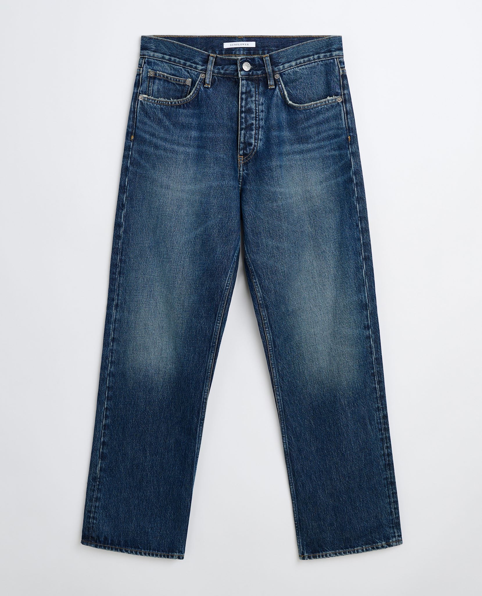 Loose fitted 5 pocket with in a dark vintage wash