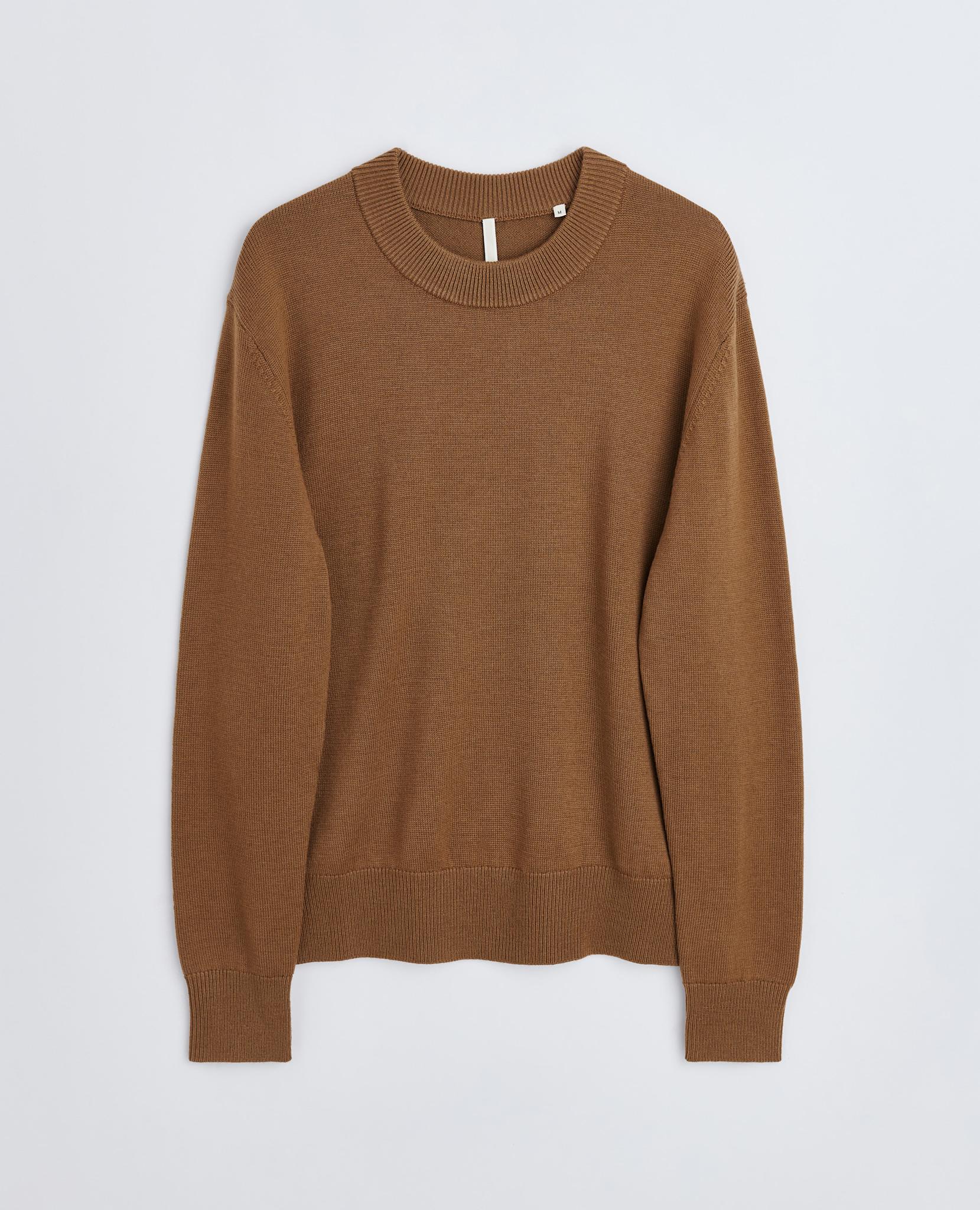 Staple crew neck knit in a plain knit technique and 1x1 ribs at cuff and hem.