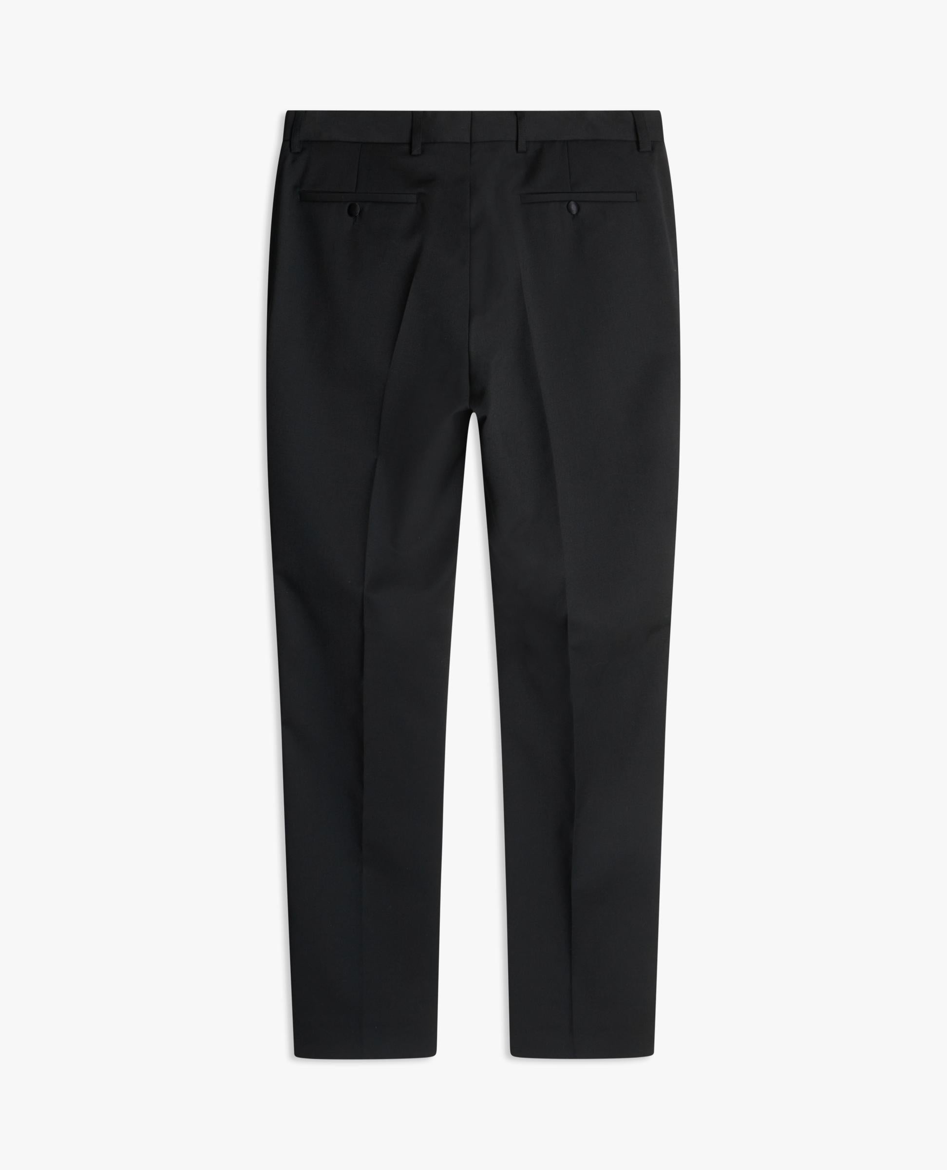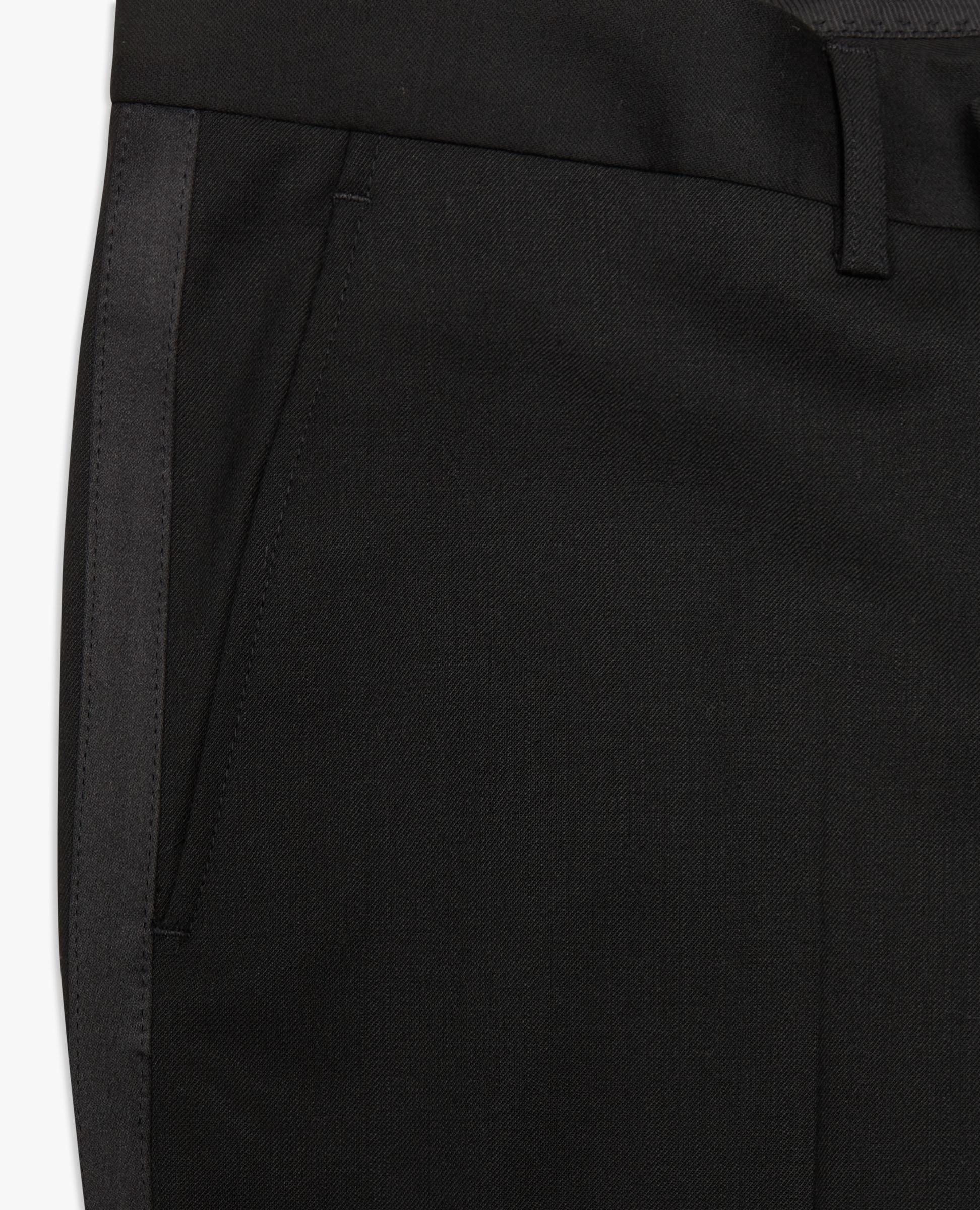 Straight leg tuxedo suiting trouser with sateen fabric stripe on sideseam. Mid weight wool mix plain weave fabric.