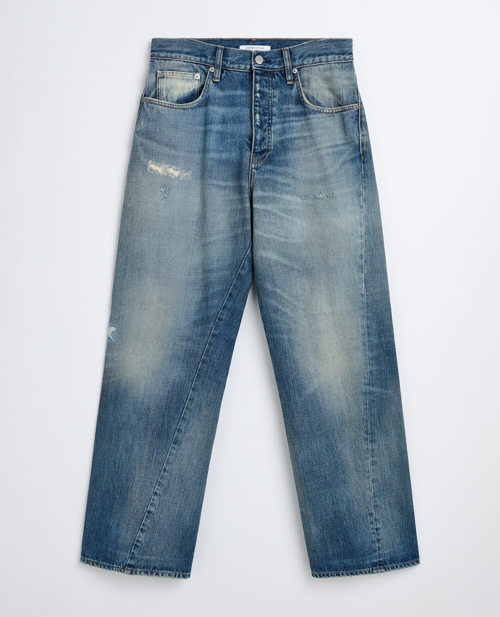 - Washed to a mid blue tone, aged tint, vintage worn effects on legs and seat, worn holes with repairs.