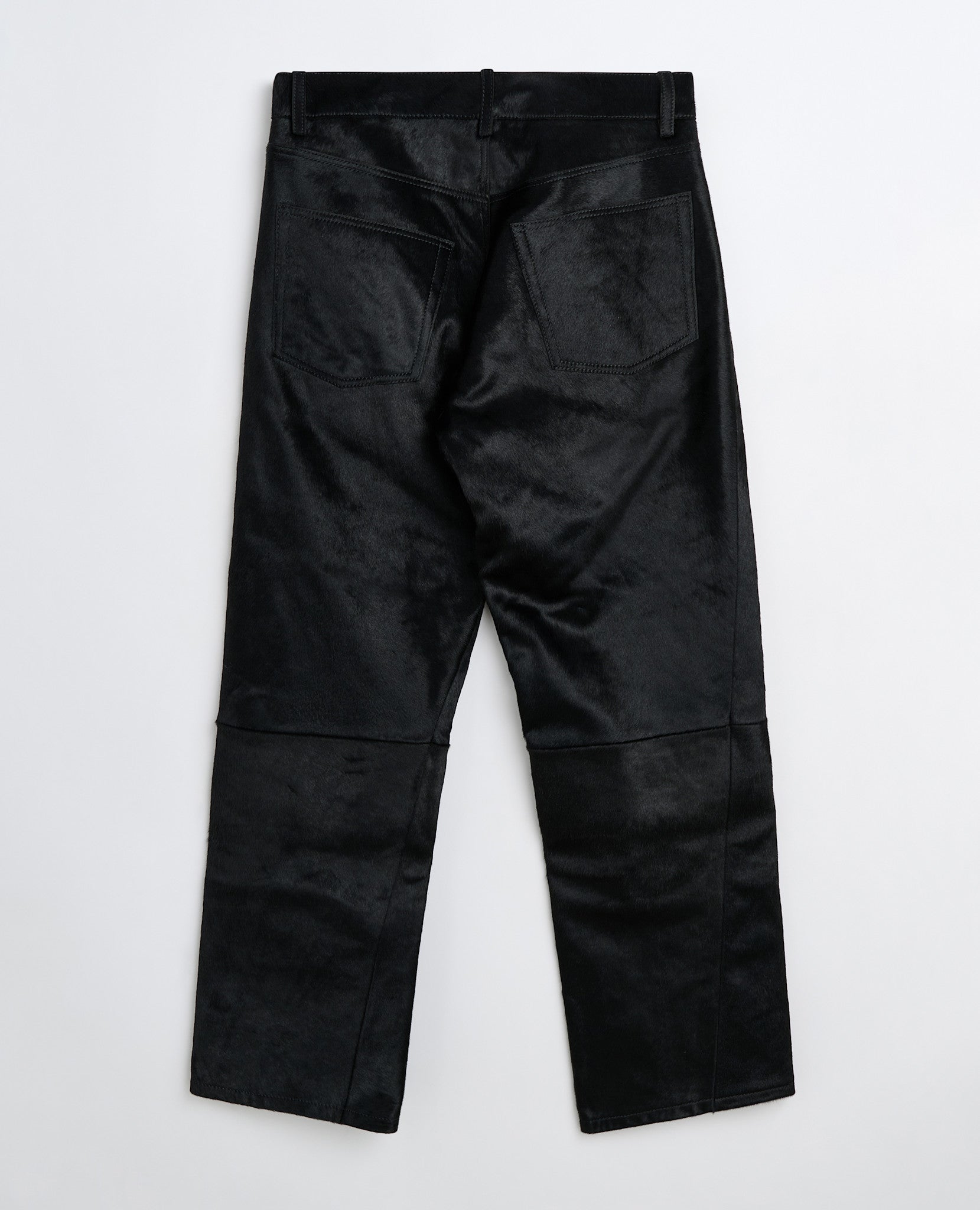 Classic 5 pocket shape with twisted seams in a black hair on hide leather