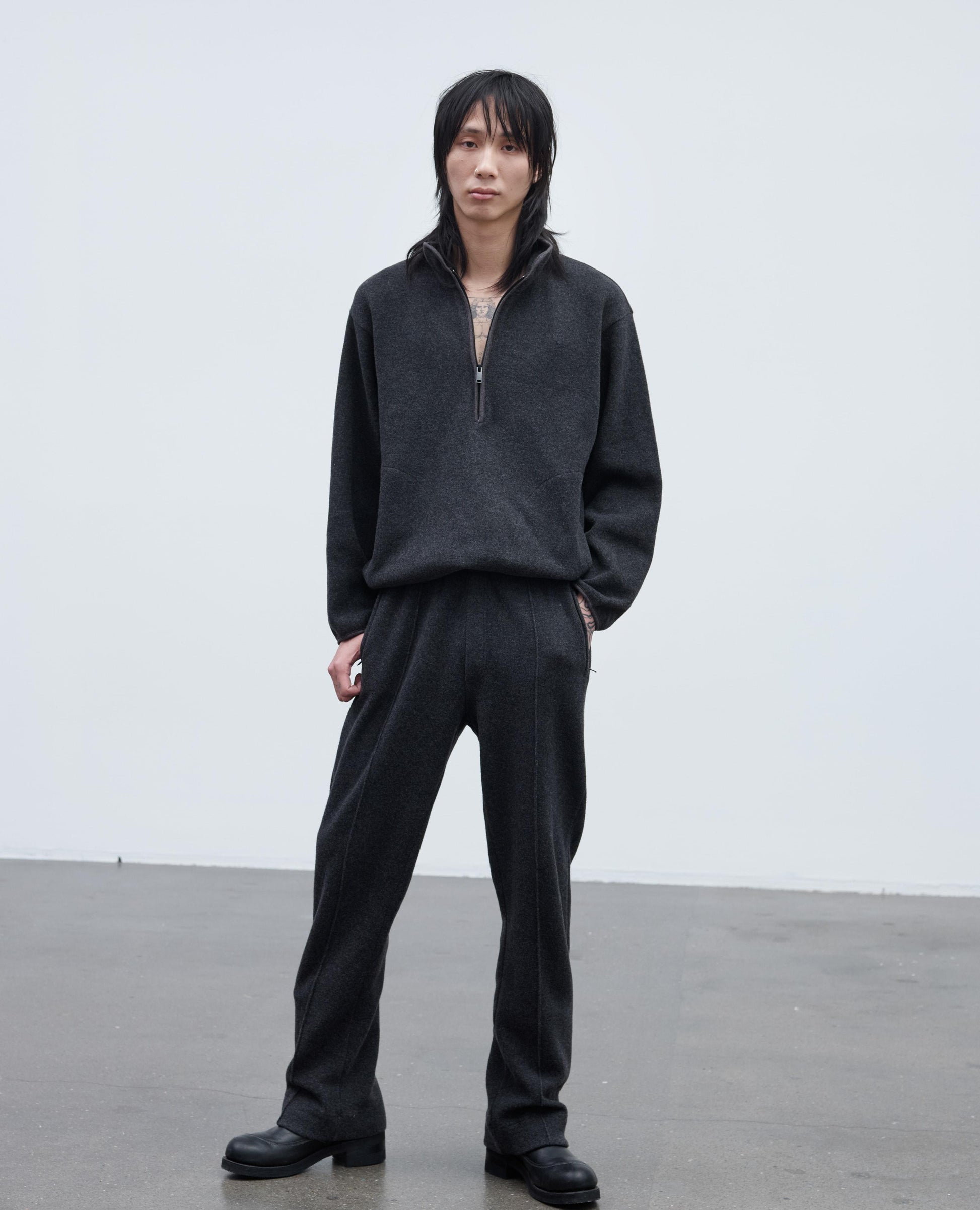 Loose-fit track pants with pleats and a drawstring waistband. Made of heavy jersey fabric which is a mix of wool and cotton.